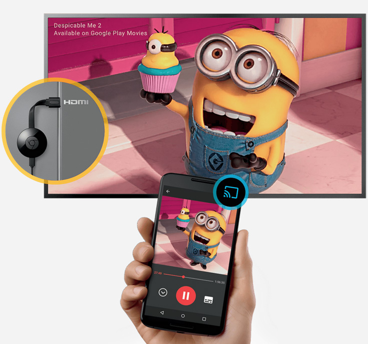 Con Google Chromecast necesitamos disponer de una Tablet o Smartphone para poder convertirlo en el mando a distancia de este servicio. Lo primero que debemos hacer es descargarnos la App oficial de Chromecast o añadir la extensión Google Cast en el navegador Chrome. Hay que conectar el Chromecast a un puerto HDMI en el televisor y conectarlo al Wifi. Ofrece acceso a cualquier dispositivo que se encuentre conectado a Chromecast en tu red permitiendo así que cualquier usuario pueda transmitir al televisor.