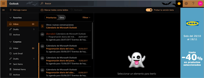 Si eres uno de los que consulta el correo todos los días, y tu gestor es Outlook, es probable que te apetezca unirte hoy a la celebración y convertir tu bandeja de entrada al más puro estilo Halloween. Tras lanzar la nueva versión de la aplicación, que por el momento continúa en fase beta, los de Micrsoft han querido añadir en esta versión en fase de pruebas el modo Halloween.