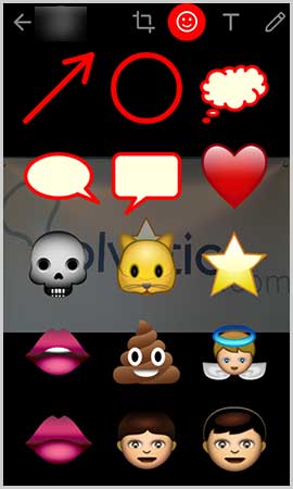 Una vez que tenemos la foto abierta, vamos a tener diferentes posibilidades. Como podemos observar en el menú principal, tenemos la opción de incluir diferentes emojis en la foto, podemos seleccionar entre alrededor de 250 diferentes siendo muy parecidos a los actuales que tiene WhatsApp.
