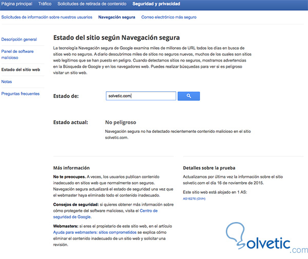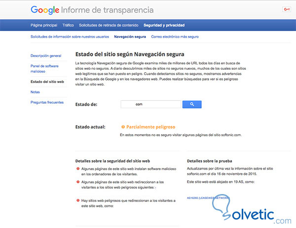 Ahora gracias a Google podemos comprobar si la pagina web que queremos visitar es verdaderamente peligrosa o no. Para esta comprobación, han creado una nueva sección en su Transparency Report, sistema que sustituye al sistema de navegación segura que Google lleva ofreciendo desde 2006.