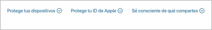 En esta otra sección vamos a encontrar información sobre cómo gestionar nuestra privacidad utilizando aquellas herramientas que nos ofrece Apple. Además se especifican diferentes opciones disponibles para que nuestros dispositivos se encuentren lo más protegidos posibles.
