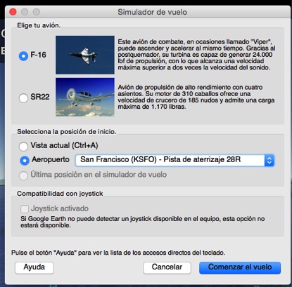 Aquí podemos elegir entre dos tipos de aviones. Unos es el F-16 el cual puede alcanzar 2 veces la velocidad de la luz, o el SR22 un avión de alto rendimiento. Además dentro de esta pestaña podemos seleccionar cual será nuestro aeropuerto de salida.