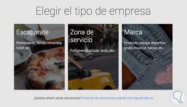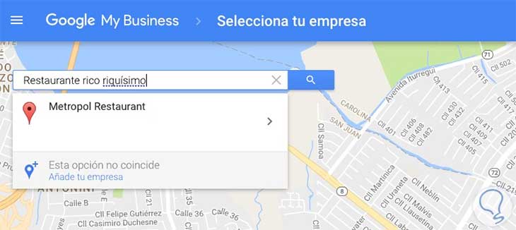 En este caso vamos a seleccionar como primer ejemplo la primera sección, es decir un escaparate, suponiendo que tenemos un restaurante. Al ser esta una empresa con ubicación física, lo siguiente que debemos hacer es introducir el nombre de nuestra empresa en el buscador para que Google la sitúe en el mapa. En el caso de que no esté registrado o no coincida con los resultados, debemos hacer clic en la opción de “Añade tu empresa”.