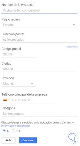 A continuación debemos rellenar un formulario con todos los datos de nuestro negocio. En el debemos incluir País, dirección, teléfono, categoría…