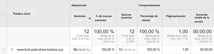 Quizás no estemos familiarizados con el termino “Spam fantasma” y si hemos estado analizando las visitas de nuestra web y nos hemos encontrado con que aparece en nuestros informes “Fuck-paid-share-buttons.xyz” es posible que desconozcamos el motivo.