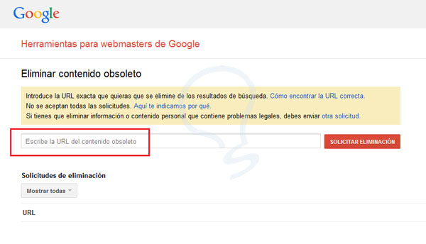 2. Si lo que quieres es eliminar sólo determinados tweets que aparecen en Google, la solución es la siguiente: dentro de la URL webmaster de Google tienes que ir a la opción de eliminar contenido que aparece en Google.
