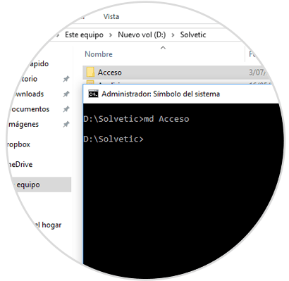 Podemos ver la carpeta creada de forma correcta. Ahora accederemos a dicha carpeta ejecutando la línea cd Acceso. Podemos crear las carpetas que deseemos usando md.