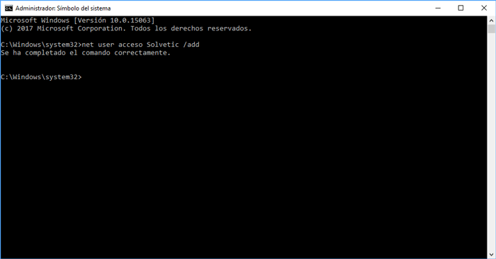 net user Usuario Contraseña /addPor ejemplo, crearemos el usuario acceso y para ello ejecutaremos lo siguiente:
