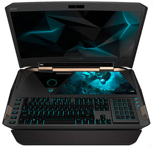 Este Acer Predator tiene un diseño que rápidamente llamó la atención en su lanzamiento. Su principal característica son las medidas que contiene ya que supera los límites de “portable”. Su cuerpo comprende los 568 x 314,5 mm, con un grosor de 83,25 mm y un peso de más de 8.7 Kg. Robusto y con un teclado más desplazado hacia delante de lo normal y un teclado numérico que pasa a ser el trackpad al darse la vuelta.