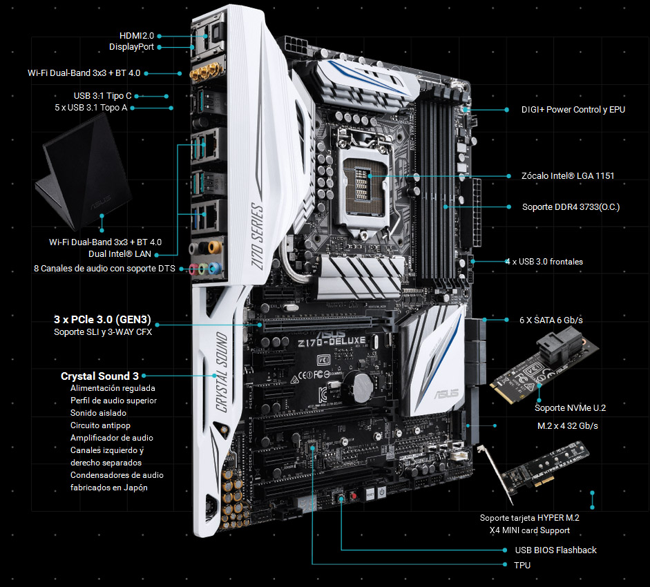 Por ejemplo con esta placa base de Asus: Z170 DELUXE (la imágen de arriba) podéis ver como en sus características de CPU y chipset aparece que aceptan procesadores de la última generación de Intel (la sexta generación). También se debe estar atento al máximo y tipo de memoria de Ram aceptada, entradas y salidas para la colocación de gráficas, redes, HDD, refrigeración y control de la misma etc.