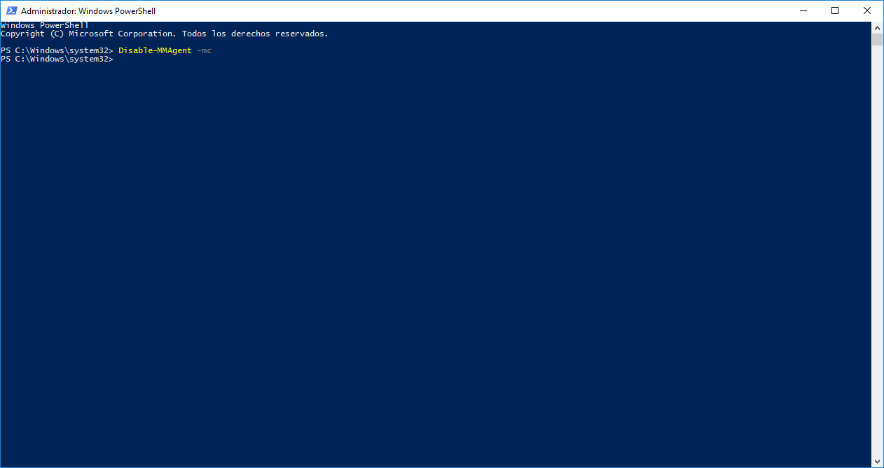 Si deseamos habilitarlo de nuevo repetiremos el mismo proceso y seleccionaremos la opción Habilitar. Como método alternativo podemos habilitar o no la compresión de memoria desde Windows PowerShell, para esto accedemos como administradores y ejecutaremos lo siguiente: