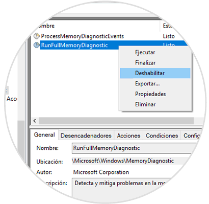 Alli debemos dar clic derecho sobre la tarea RunFullMemoryDiagnostic y seleccionar la opción Deshabilitar: