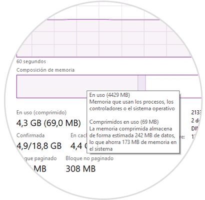 Este valor no es constante ya que será variable a medida que ejecutamos o cerramos las aplicaciones y programas de Windows 10. Podemos pasar el mouse sobre el campo Composición de memoria donde veremos información un poco más detallada sobre dicha memoria comprimida. Como vemos en la siguiente imagen estamos ahorrando 173 MB de memoria en el sistema a nivel general.