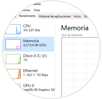 Una vez accedamos al Administrador de tareas debemos ir a la pestaña Rendimiento, seleccionar la opción Memoria y cómo podemos ver en el campo En uso (comprimido) veremos la cantidad de memoria usada para la compresión, en este caso es de 69.0 MB.