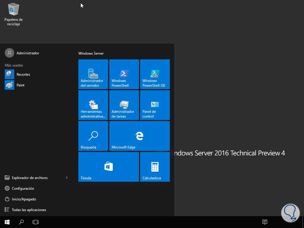 Notamos algunas diferencias (en la barra de tareas) con su anterior versión, Windows Server 2012. Al igual que en Server 2012 el Administrador del servidor iniciará de manera automática.
