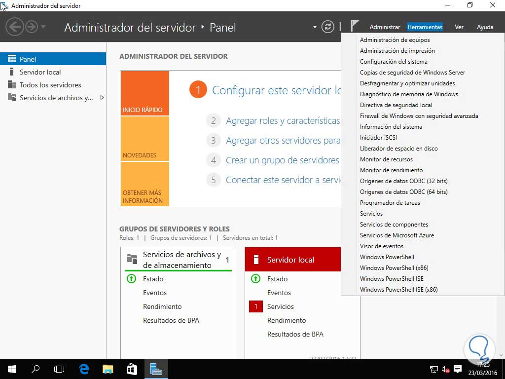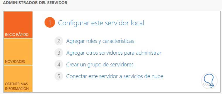 A nivel de Administrador del servidor podemos observar que en comparación con Windows Server 2012, en Windows Server 2016 se incluyen algunas más en este Server 2016, esto con el fin de poder gestionar un poco más y mejor nuestra máquina.