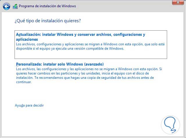 Damos clic en Siguiente y a continuación debemos aceptar los términos de la licencia de Windows. Una vez hayamos aceptado los términos de la licencia damos clic en Siguiente, a continuación, el sistema nos preguntará que tipo de instalación vamos a realizar, Personalizada o Actualización, elegimos la que se ajuste a nuestra necesidad.