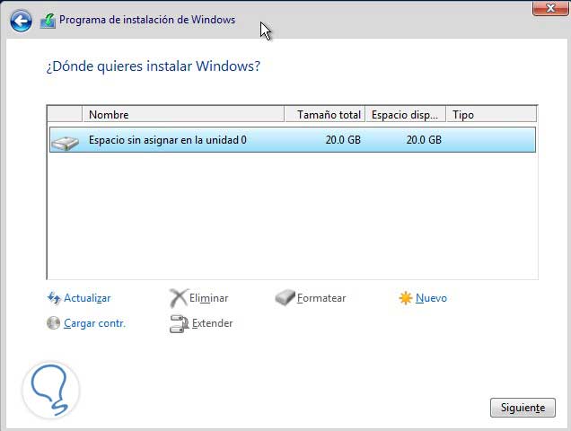 Si deseamos particionar damos clic en el botón Nuevo. En nuestro ejemplo dejaremos la configuración tal cual está sin hacer cambios.