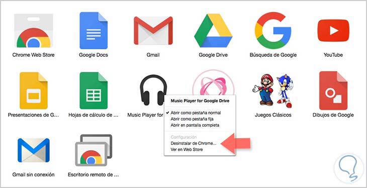 Si queremos eliminar aplicaciones web innecesarias, debemos acceder desde la barra de direcciones: chrome://apps. Para desinstalarla, pulsamos con el botón derecho del ratón encima de la app y seleccionamos “Desinstalar de Chrome”.