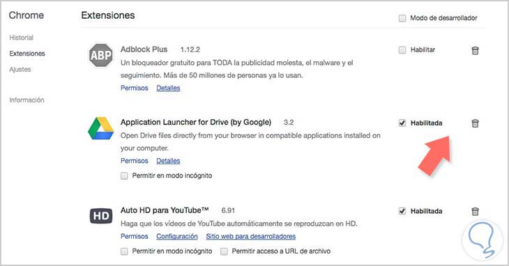 Podemos desmarcar aquellas extensiones que no nos interesen de momento o seleccionar el icono de la papelera para eliminarlas de manera definitiva.