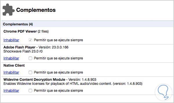 Para poder proceder a su desactivación y revisión tenemos que poner en la barra del navegador : chrome: // plugins. Una vez aquí podremos seleccionar que los queremos inhabiltar.