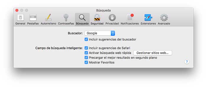 Cuando realizamos una búsqueda en Safari, usando cualquier motor de búsqueda, detrás de este proceso se realizan una serie de tareas que pueden afectar nuestra privacidad en todo el proceso de navegación. Para acceder a las opciones de búsqueda en Safari vamos al menú Safari / Preferencias y allí elegimos la pestaña Búsqueda y accederemos a lo siguiente:
