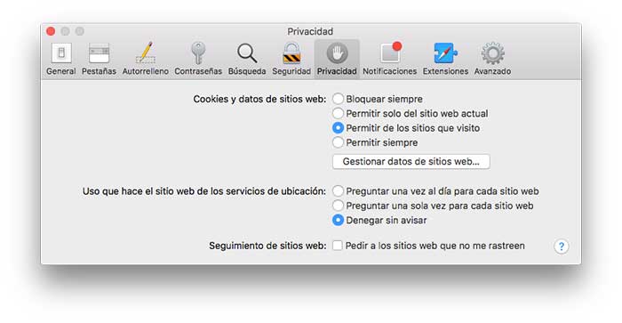 Dentro de la ficha Privacidad en el menú Preferencias de macOS Sierra contamos con diversas posibilidades de controlar la forma como navegamos en Safari: