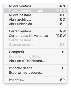 Esta es una de las formas comunes como podemos navegar en Safari sin dejar rastros ya que al usar la navegación privada evitamos que todos los sitios que naveguemos sean registrados en el equipo. Para acceder a esta funcionalidad vamos al menú Archivo / Nueva ventana privada. De esta forma iniciaremos una navegación segura en Safari.