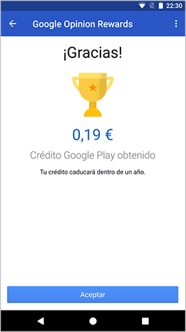 Finalmente te damos la posibilidad de que si la aplicación de pago que necesitas no la encuentras disponible en ningún caso, te plantees la posibilidad de realizar encuestas para Google y de este modo conseguir crédito para Play Store. Para poder conseguir este crédito lo único que debes hacer es descargar la aplicación de Google Opinion Rewards y responder a unas preguntas básicas sobre nosotros.