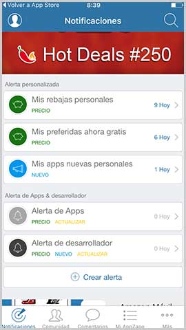 Con esta aplicación que podemos encontrar disponible tanto para Android como para iPhone, vamos a poder disponer de diferentes secciones a través de las cuales personalizar nuestros intereses en cuanto a las aplicaciones. Las secciones se dividen en “mis rebajas personales” destinada a las aplicaciones que han bajado de precio y que podemos probar aplicando el descuento que nos ofrecen. Otra de las secciones llamada” mis preferidas ahora gratis” la cual se destina a todas aquellas aplicaciones que han pasado de ser de pago a tener una descargar totalmente gratuita. Por último nos encontramos con una sección llamada “mis Apps nuevas personales” en la que vamos a poder configurar alertas con aquellas aplicaciones en las que estamos realmente interesados y que queremos ser informados en el momento en que bajen de precio o sean gratuitas.