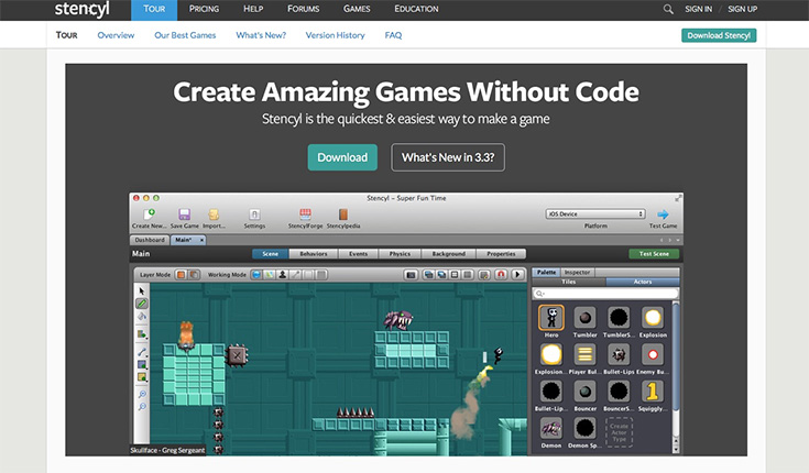 Stencyl se trata de una plataforma para la creación de juegos 2D y definitivamente unos de los programas mas sencillos en la realización de videojuegos, ya que su editor parte de unos fundamentos muy claros. La interfaz que tiene es drag & drop. Es ideal si queremos realizar algún tipo de videojuego de puzle, pero también permite diseñar juegos de otros géneros. Dispones de un almacén de recursos y de una serie de tutoriales que te indican paso a paso como ir realizándolo.