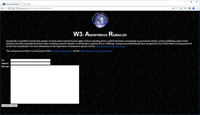 Esta opción nos ofrece una interfaz sencilla en al cual basta con completar los campos respectivos para el envío del correo electrónico anónimo. Esta opción registra las direcciones IP usadas.