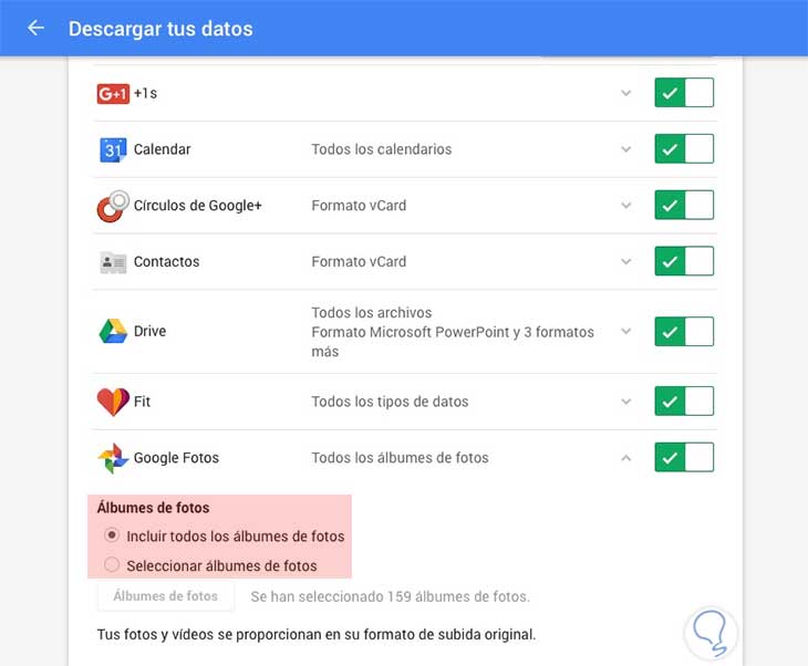 Una vez que ya estamos dentro, tenemos que seleccionar “Google Fotos” y que álbumes son los que queremos descargarnos. Podemos crear un archivo ZIP con aquellos álbumes que hayamos seleccionado.