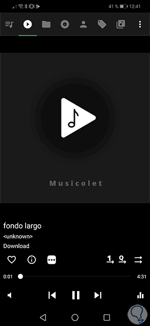 Musicolet es un reproductor de interfaz sencilla que permite crear y gestionar diferentes colas siendo el único que da la posibilidad de tener varias colas a la vez hasta un máximo de 20. Su interfaz es sencilla y accesible permitiendo una navegación sin problemas siendo bastante intuitiva. Dentro de la aplicación encontraremos diferentes apartados como las colas, carpetas, listas de reproducción, álbumes… Musicolet permite el control de la aplicación mediante el uso de auriculares y sus botones.