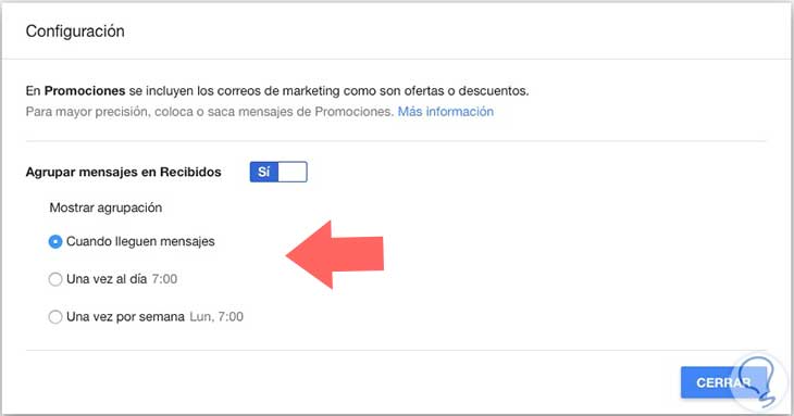 Quizas no nos interese tener una alerta cada vez que recibimos por ejemplo los correos relacionados con las promociones. Para ello podemos configurar sus alertas determinando si queremos que esta agrupación se muestre cuando lleguen los mensajes, una vez al día o únicamente una vez por semana.