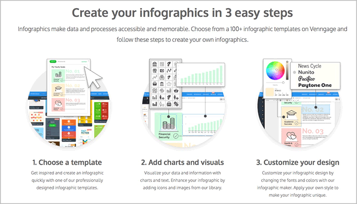 Con esta web tenemos la posibilidad de crear infografías de forma sencilla y rápida. Tenemos a nuestra disposición diferentes plantillas y gráficos así como diversidad de temas. Podemos además cargar nuestras propias imágenes y ajustar los temas a nuestras preferencias.