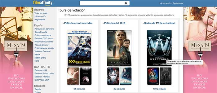 Sin duda una de las web más conocidas para la valoración de películas es Filmafinnity. En esta página vamos a poder encontrar una cantidad inmensa de películas y series las cuales los usuarios han votado para que podamos ver de este modo cual es la opción popular.