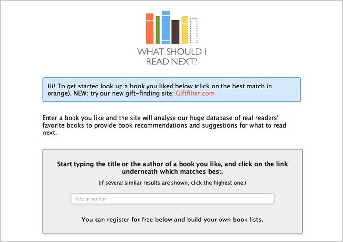 Este web te lo va a poner mas fácil que las anteriores si lo que realmente quieres es que te ofrezcan directamente sugerencias. Lo único que tienes que hacer es introducir un autor o tÍtulo que te gusta en su campo de búsqueda, y de manera automática nos va a devolver una serie de resultados parecidos a lo introducido. Además incluye un enlace directo con Amazon para poder ver su ficha y comprarlo si nos interesa.