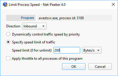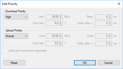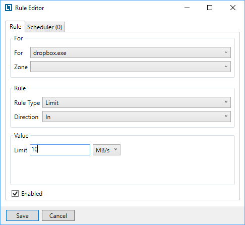 Para crear un límite de ancho de banda basta con dar doble clic sobre la aplicación o servicio deseado y definir los valores en la ventana desplegada: