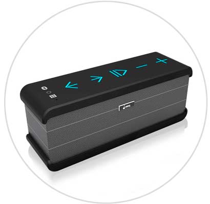 Altavoz portátil con un diseño elegante en metal y controles planos sensibles táctiles que hacen una interacción mucho más sutil que la tradicional botonera.