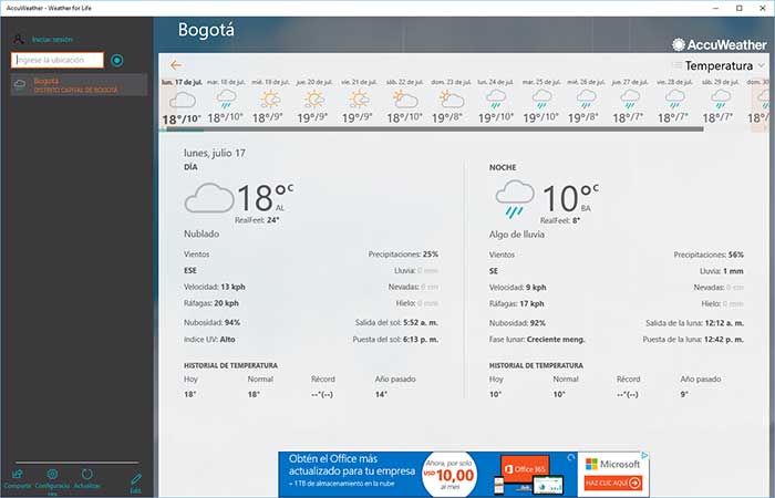 Esta aplicación gratuita nos permite conocer en detalle el estado actual del clima y es una aplicación propia de Microsoft.