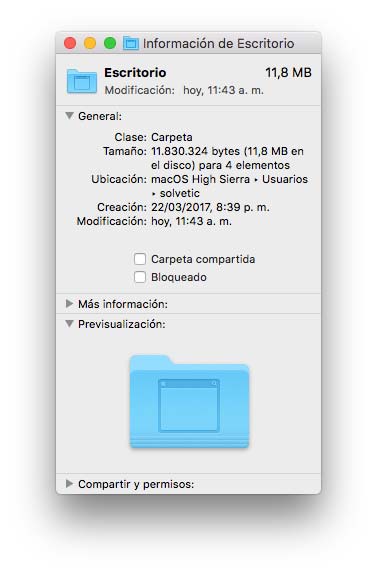 Con la combinación de teclas Comando + I obtendremos información de un archivo seleccionado, donde será posible ver detalles como el tipo de archivo, su tamaño, cuándo fue creado y modificado por última vez, entre otros atributos.
