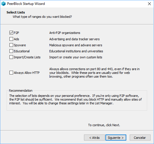 PeerBlock es la actualización de PeerGuardian 2 el cual bloquea el acceso de todo tipo de redes antip2p. Con esta aplicación podremos enfocarnos exclusivamente en el tráfico de dirección IP salientes y entrantes en el sistema. Al ejecutarlo la aplicación nos indicara que tipo de sitios web, por categoría, han de ser bloqueados con PeerBlock.