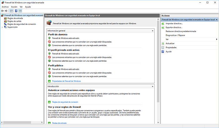 El propio firewall incluido en Windows es una aplicación que nos permite crear y administrar reglas entrantes y salientes con el fin de evitar que aplicaciones no autorizadas tengan acceso al sistema. Del mismo modo de forma constante el firewall de Windows monitorea constantemente el sistema en búsqueda de amenazas y vulnerabilidades.