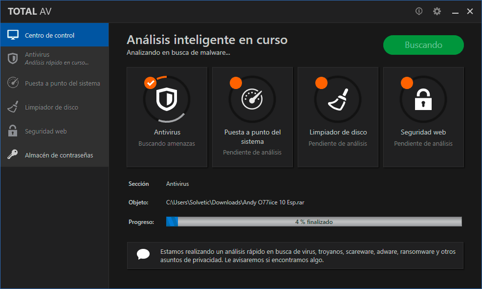 Este antivirus protege tu Windows 10 frente tu ordenador frente a ataques posibles de malware que puedan infectar nuestro equipo. Esta protección se hará en tiempo real evitando infecciones de ransomware, hackers y malware. Total AV evita que cualquier spyware pueda recopilar información que pueda ser traficada por terceras partes.