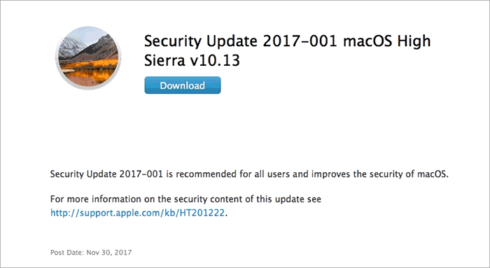 A continuación debemos dirigirnos al siguiente enlace oficial en el que vamos a poder descargar la actualización de Seguridad 2017-001 macOS High Sierra v10.13.