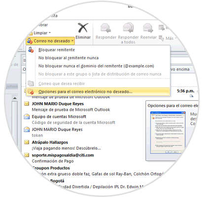En Outlook 2010 vamos a la ficha Inicio, grupo Eliminar y allí desplegamos la ficha Correo no deseado donde seleccionaremos la línea Opciones para el correo electrónico no deseado:
