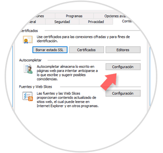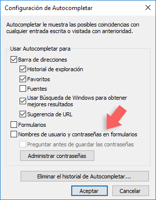 Para aquellos usuarios que aun usan Internet Explorer como su navegador por defecto el proceso para evitar que se pregunte si deseamos guardar las contraseñas es el siguiente: Damos clic en el icono de piñón en la parte superior y seleccionamos la línea Opciones de Internet. En la ventana desplegada vamos a la ficha Contenido y seleccionamos la opción Configuración en el campo Autocompletar: