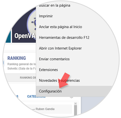 Microsoft Edge es el navegador predeterminado en Windows 10 el cual ofrece una serie de opciones de configuración y personalización entre las cuales se encuentra el preguntar si deseamos almacenar las contraseñas de los sitios visitados. Para evitar esto damos clic en el icono de tres puntos horizontales ubicado en la parte superior derecha y seleccionamos la opción Configuración:
