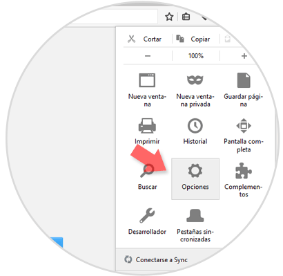 Para realizar este proceso en Mozilla Firefox damos clic en el icono de tres líneas horizontales en la parte superior y seleccionamos el botón Opciones: